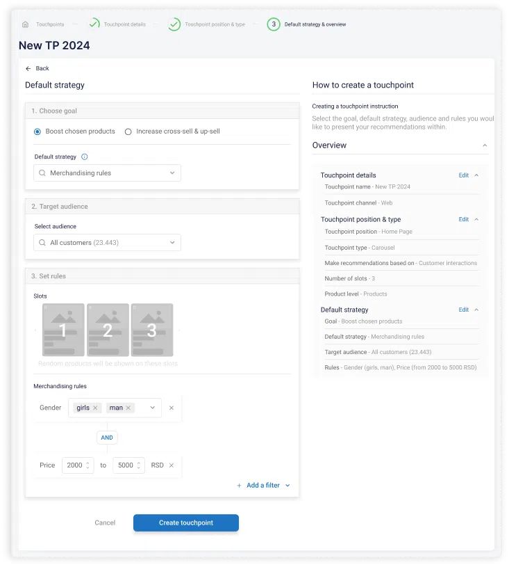 Merchandising Rules let you define exactly what products appear in your website’s carousel, using criteria that align with your business objectives. Forget relying solely on AI to make decisions—this tool gives you the control to customize product displays.