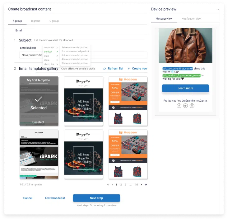 Based on your audience's behavior, preferences, and interests, you can adjust the content of every message and send a relevant offer to every member.