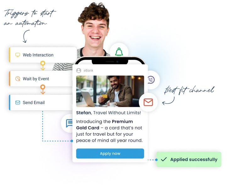 Ove ciljanje preporuke ne samo da zadovoljavaju trenutne potrebe, već pokazuju da je vaša banka zainteresovana za finansijsku dobrobit klijenta. Kreirajte personalizovana iskustva koja duboko rezoniraju sa kupcima. Podstaknite ih na akciju i izgradite dobar temelj. Neka vaša banka bude njihov prvi izbor.