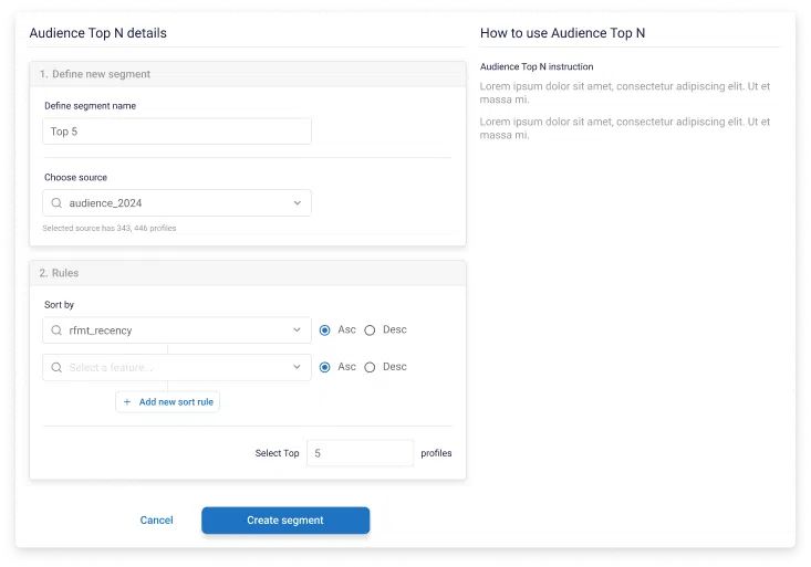 The TOP N functionality is one of the key tools within the Solver Segmentation Studio. It allows you to efficiently extract users from a specific segment based on certain characteristics and rank them from best to worst.